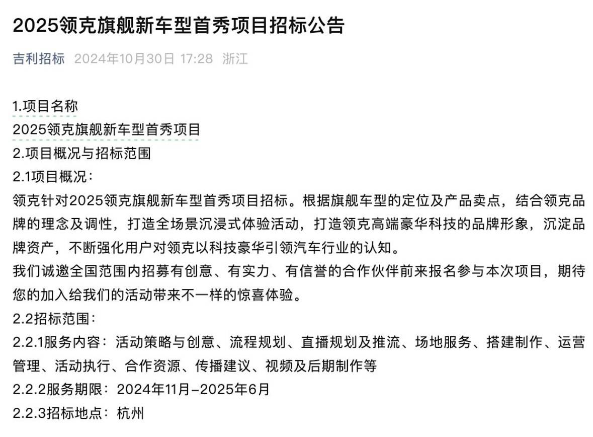 目前,吉利已經(jīng)開(kāi)始為這款新車(chē)的首秀項(xiàng)目進(jìn)行公開(kāi)招標(biāo),預(yù)計(jì)有望在明年三季度前完成正式上市。