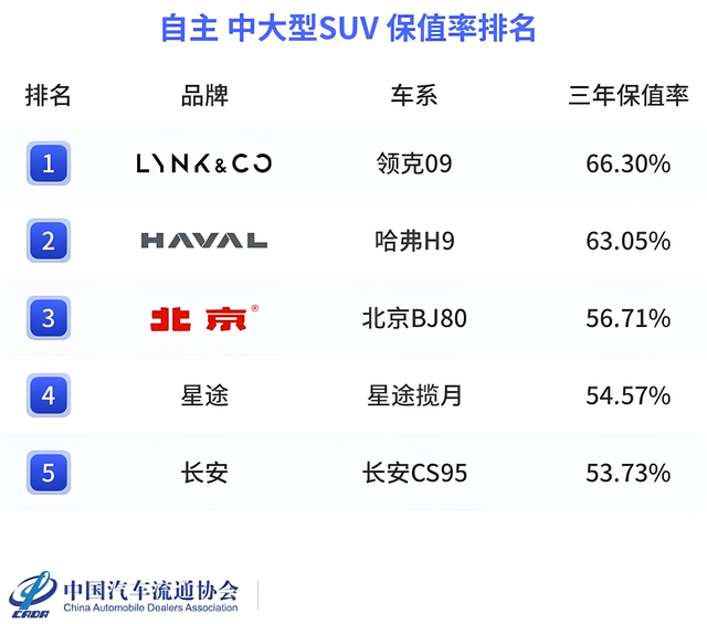 值得一提的是,領克09的保值率部分,根據中國汽車流通協會最新發布的上半年保值率數據,領克09(讀測評)在6月份的三年保值率達到了66.30%,這一成績使其位居自主中大型SUV保值率排行榜的首位。與之相比,長期以來在保值率方面有一定優勢的漢蘭達,其三年保值率為69.04%,兩者之間的差距已微乎其微。這一數據無疑打破了日系車型在保值率方面的傳統優勢,顯示了領克09在市場上的強勁競爭力。
