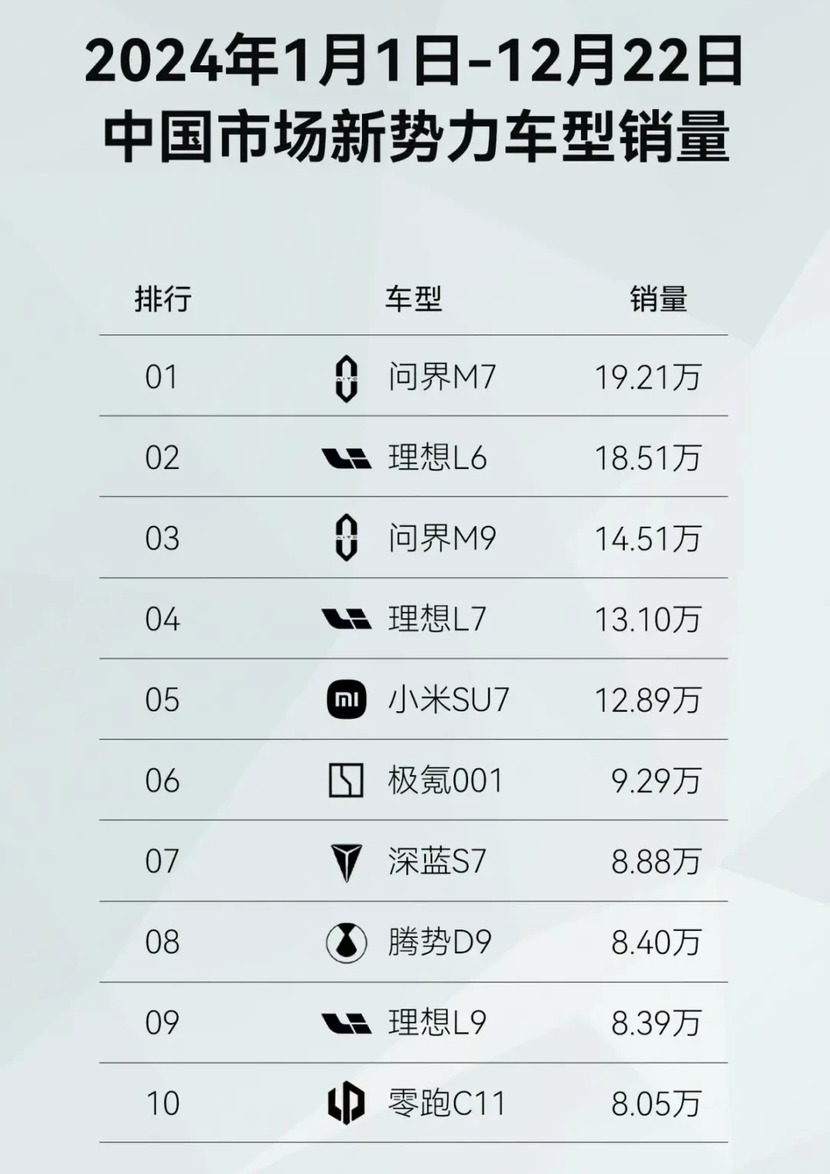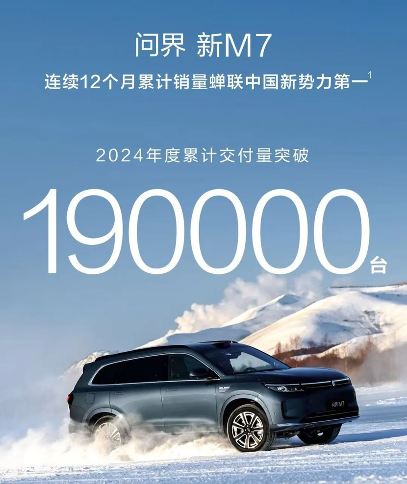 12月18日,鴻蒙智行官方宣布,問界新M7 2024年度累計交付量突破19萬輛,連續12個月累計銷量蟬聯新勢力第一。