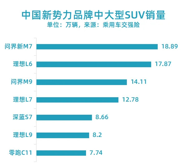 據乘用車交強險顯示,1月-12月15日,問界新M7以18.89萬輛的成績排在國內新勢力品牌中大型SUV銷量第一,比第二名理想L6多了1萬輛。