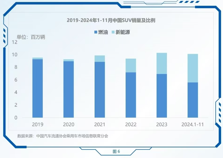 咱們可以看一組數據,從2019-2024年1-11月份,新能源SUV在該市場的占比在不斷攀升,到2024年新能源SUV的滲透率達到了49%,其中新能源中大型SUV市場的增長率足足達到了51%。