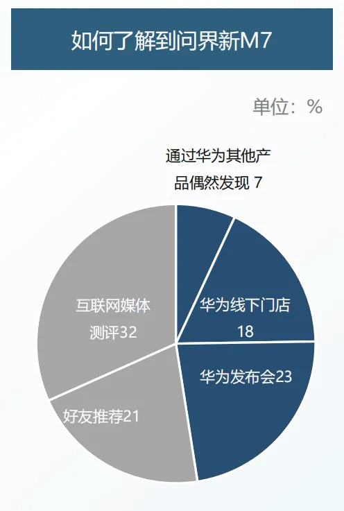 根據《中國中大型SUV市場研究報告》對于問界新M7的獲客渠道做了調查,互聯網媒體評測、廣告占比最大,達32%;華為發布會占比23%;好友推薦占21%;華為線下門店和華為其他產品引流各占18%和7%。