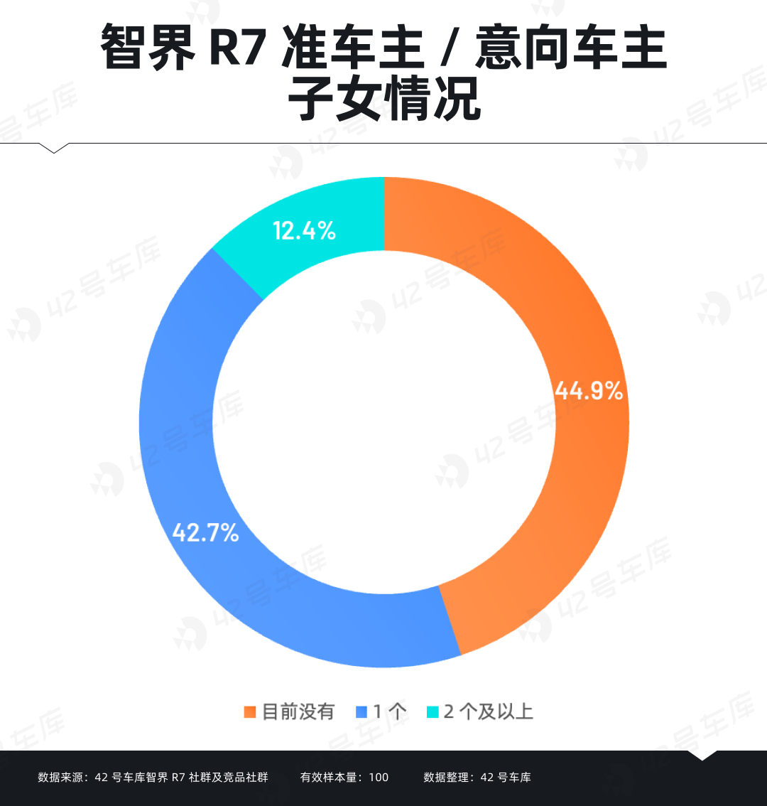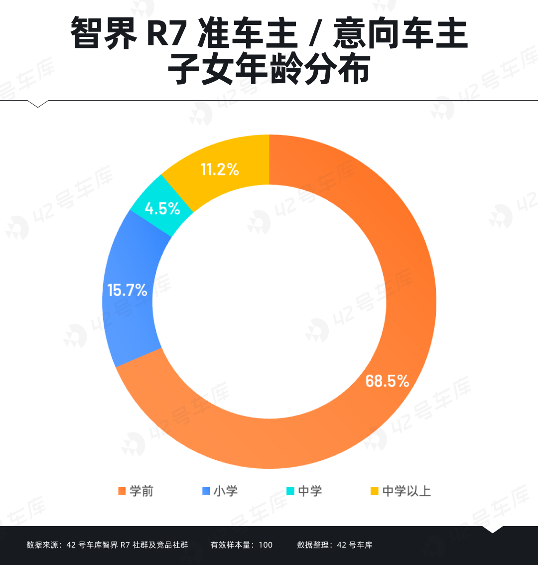 調研結果顯示,受訪用戶中目前無子女和僅有一個子女的家庭分別占據了 44.9% 和 42.7%,而在獨生子女家庭中,子女處于學前階段(0-6 歲)的比例高達 68.5%。這一數據可以看出智界 R7 的目標用戶群體以年輕的、尚未生育或僅有一個年幼子女的家庭為主。