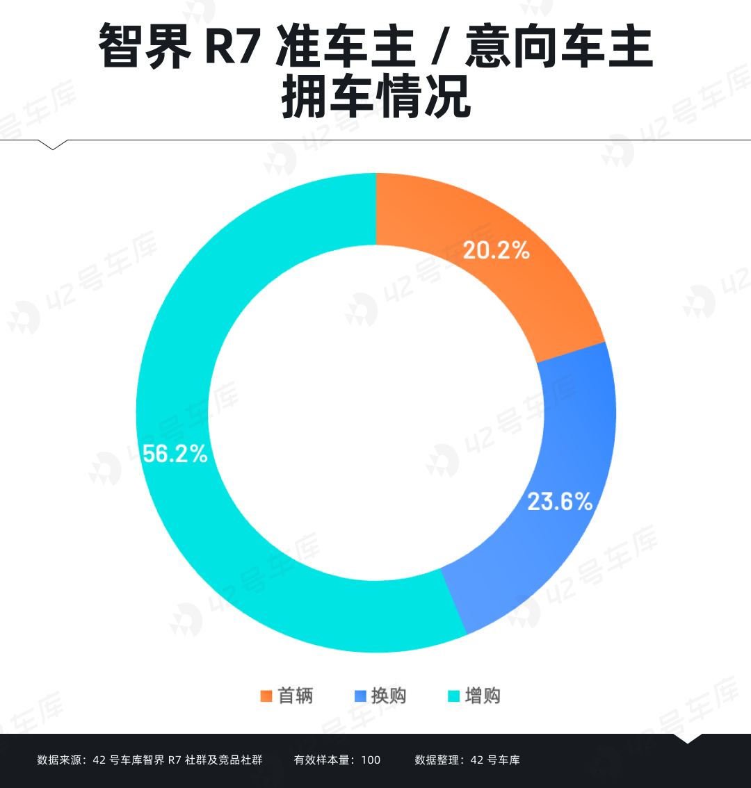 調研數據顯示,超過 56.2% 的受訪用戶表示這將是他們的增購車輛,23.6% 的用戶為換購,而首次購車的用戶僅占 20.2%。可以看出增購用戶已成為智界 R7 目標用戶群體的絕對主力。