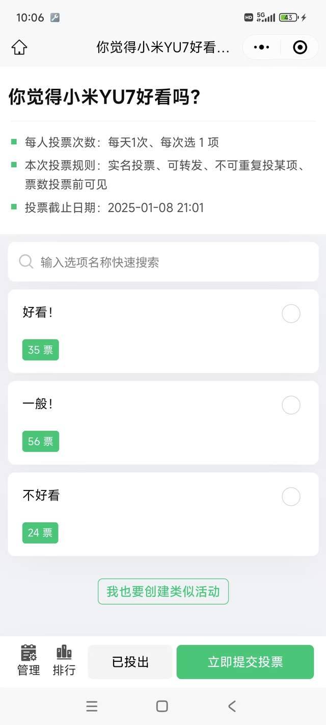 目前老圖從小米YU7準(zhǔn)車主群①②③的調(diào)查數(shù)據(jù)看,1000多人的投票人數(shù)有115人,其中35票好看,56票一般,24票選擇不好看。當(dāng)然這個也是有局限性的,畢竟要買的肯定投好看,觀望猶豫的可能投了一般,而不想買的自然投了不好看。