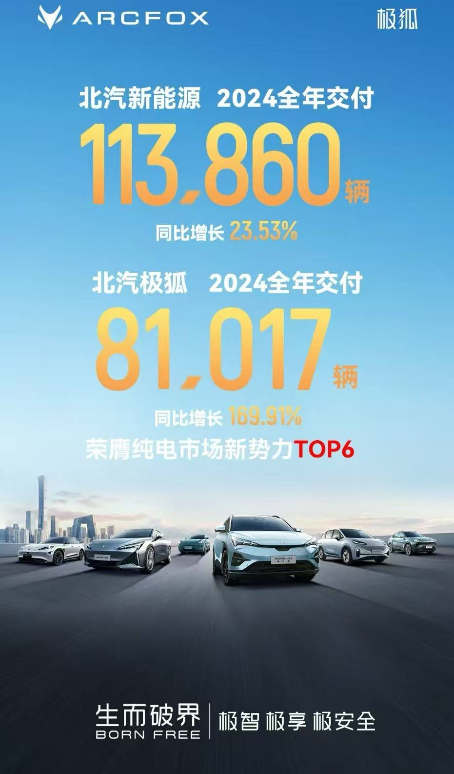2024年,北汽新能源及極狐汽車逆勢突圍,勾畫出了令人振奮的上揚曲線。其中,北汽極狐呈現出持續強勁的增長勢頭,特別是進入下半年,月銷穩定在11000臺以上,全年銷量達成81017臺,同比增長169.91%,連續3年實現銷量翻番。2024最后一個月,極狐銷量達到12032臺,位居純電市場新勢力TOP6,國企純電品牌TOP1,不僅跨入了高質量發展新階段,更成為北汽新能源快速向前的主要引擎。