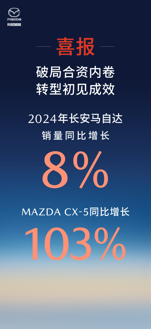 新年伊始,長安馬自達公布了2024全年銷量成績,銷量較上年實現同比增長8%,其中MAZDA CX-5同比增長103%。面對國內汽車市場白熱化的內卷競爭與嚴峻挑戰,長安馬自達堅定推動新能源轉型的同時,緊跟市場脈搏,持續煥新產品競爭力,以多元化的營銷舉措回饋用戶需求,堅持以高價值驅動自身發展。