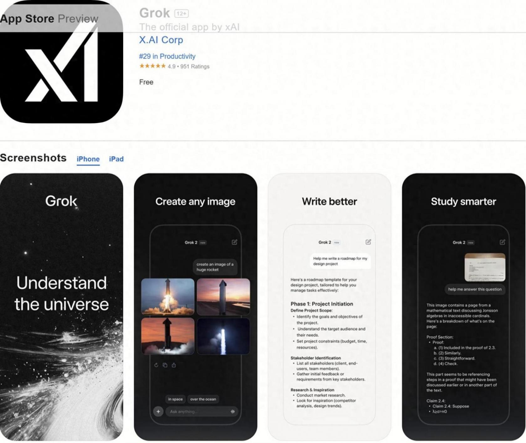 埃隆-馬斯克(Elon Musk)的人工智能公司 xAI 正在為其聊天機(jī)器人 Grok 測試一款獨(dú)立的 iOS 應(yīng)用程序。該應(yīng)用目前已在美國、澳大利亞和印度等多個(gè)國家上線,可以訪問來自網(wǎng)絡(luò)和 X 的實(shí)時(shí)數(shù)據(jù),并提供改寫文本、總結(jié)長段落、小問答等生成式 AI 功能,還能根據(jù)文本提示生成圖片。