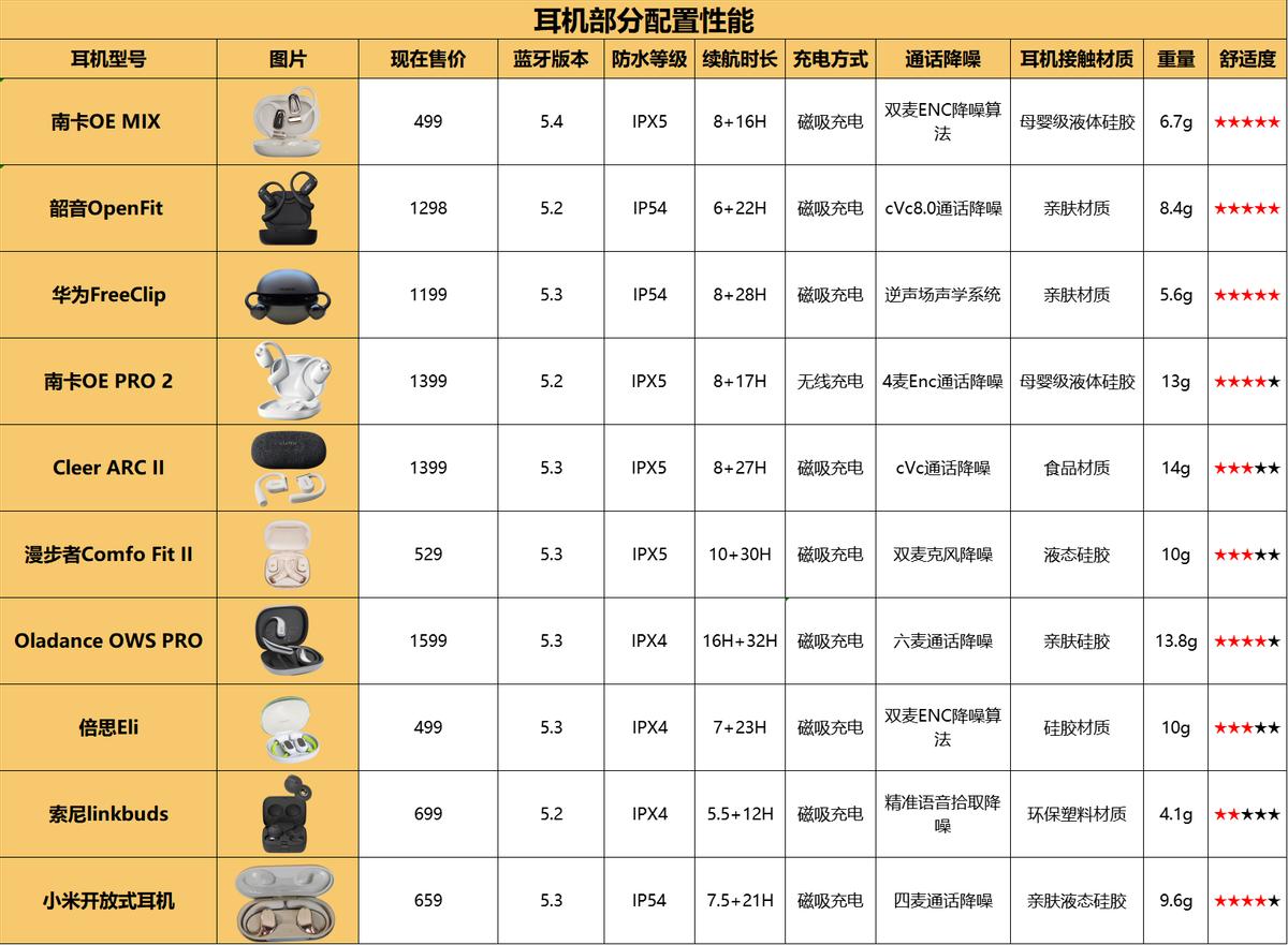 本次測評涵蓋了方方面面,從音質的細膩表現到佩戴的持久舒適度,從藍牙連接的穩定性到續航能力的強弱,所有細節都一一考量。參與測評的品牌包括索尼、南卡、韶音、華為、漫步者等眾多知名廠商,每款耳機都展現了各自獨特的技術優勢和產品特色。