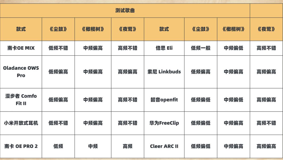分別使用 10 款開放式耳機進行試聽比較典型的測試高中低頻的三首歌曲《塵鼓》《橄欖樹》《夜鶯》,試聽每首歌曲的時間為一分鐘。