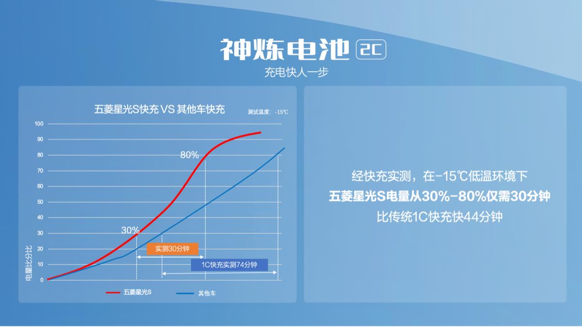 不僅如此,星光S純電標(biāo)配的神煉電池2C,還將充電倍率做到了2C,且電芯間隔板還有保溫設(shè)計(jì),滿(mǎn)足加熱/保溫之余,還能明顯縮短充電時(shí)間。在零下15度寒冷環(huán)境實(shí)測(cè)時(shí),星光S完成30%-80%電量補(bǔ)充,僅需30分鐘,足足比傳統(tǒng)1C充電車(chē)型快了44分鐘。