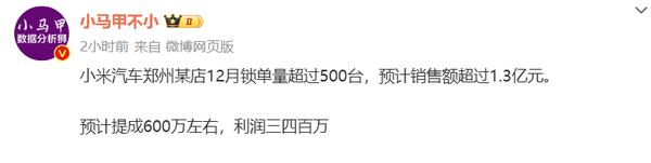 近日,CNMO注意到,有數(shù)碼博主透露,2024年12月,小米汽車河南鄭州某門店單月單店鋪鎖單超過500臺(tái),預(yù)計(jì)單店總銷售額超過1.3億元,預(yù)計(jì)銷售總提成600萬(wàn)元,利潤(rùn)300萬(wàn)-400萬(wàn)元。