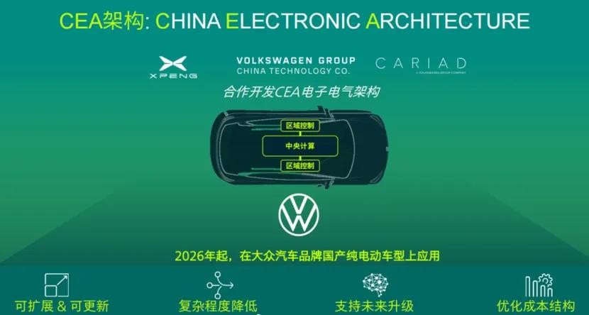 去年1月,匯聚了3000名技術專家的大眾汽車(中國)科技有限公司(VCTC)全面投入運營,作為大眾集團德國總部之外最大的研發中心,VCTC主攻下一代智能網聯汽車的開發。CEA電子電氣架構正是VCTC和CARIAD中國以及小鵬汽車合作開發的成果,2026年在大眾在華新車上落地。