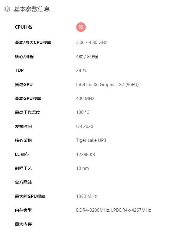 Intel 酷睿i7 1185G7是一款CPU系列為酷睿i7 11代系列的筆記本電腦CPU,主頻為3GHz,睿頻加速可達4.8GHz,三級緩存高達12MB。此外這顆處理器支持12-28W的動態TDP調整,基于深度優化的Willow Cove微架構設計,并且采用了更為先進的10nm SuperFin晶體管工藝。