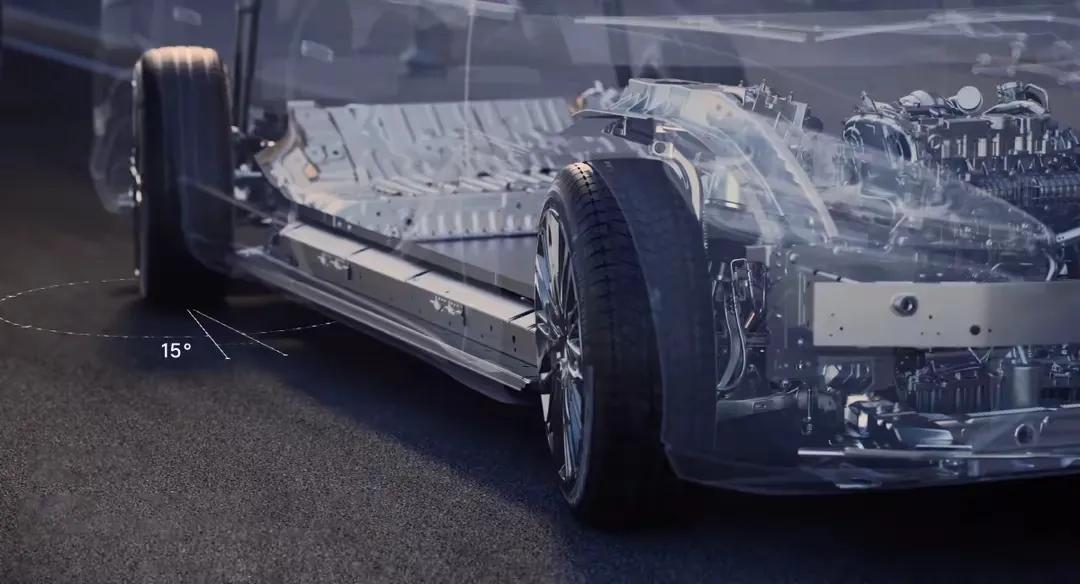 騰勢Z9還擁有智能蟹行功能,通過前后輪同向轉動,實現整車斜向平移,實現行業最大15度的蟹行角度,配合智能駕駛,提高車輛狹窄空間的通過性。