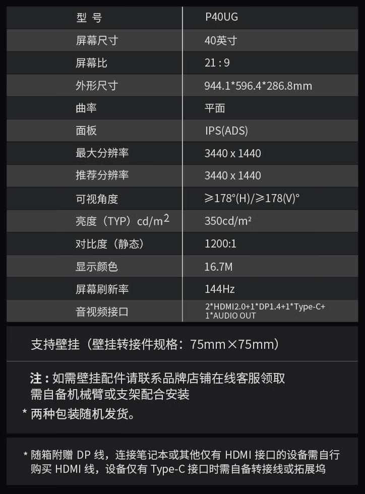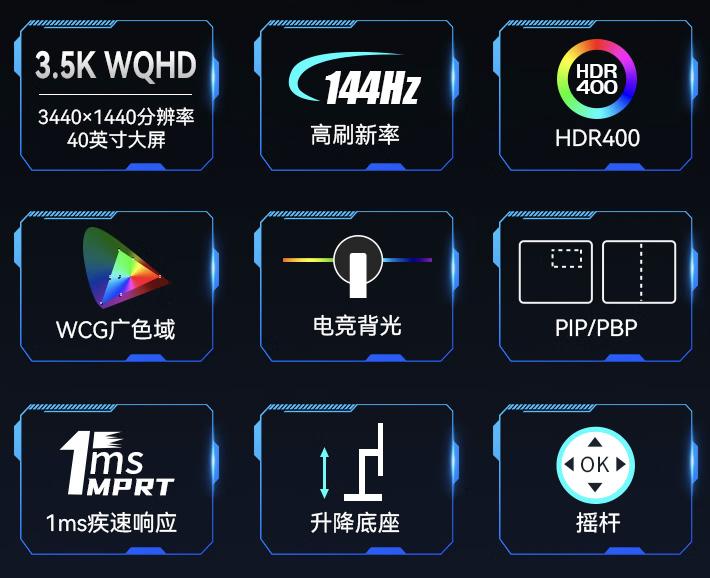 這款顯示器配備 40 英寸 21:9 比例 3440x1440 分辨率 144Hz IPS 面板,亮度 350 尼特,靜態(tài)對(duì)比度 1200:1,支持 8-Bit 色彩,覆蓋 99% sRGB、88% AdobeRGB 色域。支持 PBP / PIP。
