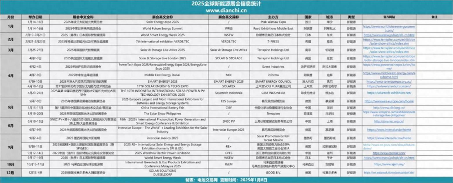 本次電池交易網共搜集全球新能源展會22家,展會地區涵蓋歐洲、亞洲、美洲等多個地區和國家,除了7、8、11三個月,其他月份都有新能源展會。以下為詳情:
