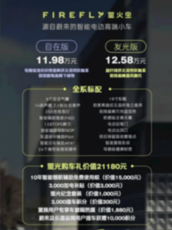值得注意的是,螢火蟲的起售價相較于14.88萬元起的預售價直降2.9萬元,相當于打了8折,新車將于4月29日開啟交付。而螢火蟲的BaaS方案,將于8月1日推出。