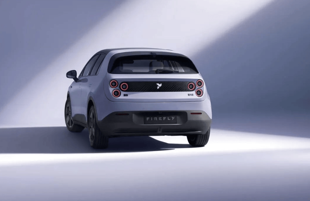 新車前臉采用封閉式設計,前大燈組由三個圓形光環組成,車燈點亮后極具辨識度。車頭正中央是firefly螢火蟲的品牌標識,該品牌標識由兩部分組成,共同組成了“y”字母,對應螢火蟲的首字母。