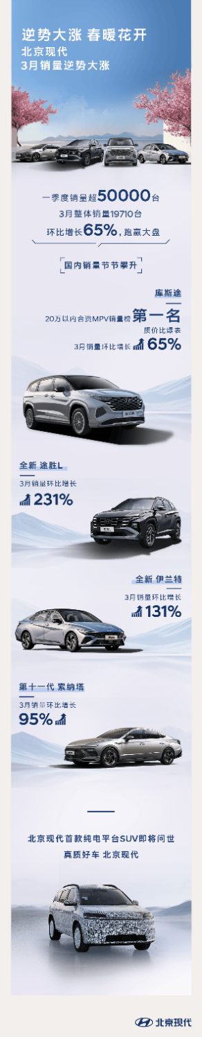 而這種回歸,有一個(gè)合資車(chē)企理所當(dāng)然的接盤(pán)了,那就是北京現(xiàn)代。小編并非刻意為它貼金,一切以數(shù)據(jù)為證:它在一季度的銷(xiāo)量超過(guò)了50000臺(tái),跑贏合資車(chē)“集體反攻”大盤(pán)。僅3月銷(xiāo)量就達(dá)到19710臺(tái),環(huán)比增長(zhǎng)65%。具體來(lái)看,3月環(huán)比增長(zhǎng)65%,位列20萬(wàn)以?xún)?nèi)合資MPV銷(xiāo)量榜第一;全新3月銷(xiāo)量環(huán)比增長(zhǎng)達(dá)131%;第十一代索納塔3月銷(xiāo)量環(huán)比增長(zhǎng)95%;全新途勝L3月銷(xiāo)量環(huán)比增長(zhǎng)更是高達(dá)231%。如此亮相的業(yè)績(jī),無(wú)疑成為合資車(chē)集體反攻的“孤證”,同時(shí)也引發(fā)友商們的反思:它到底做了什么?