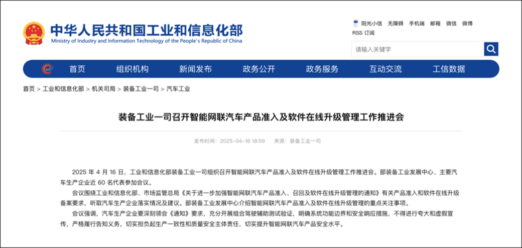 當然,在前兩天,只因工信部于4月16日組織召開智能網聯汽車產品準入及軟件在線升級管理工作推進會,就《關于進一步加強智能網聯汽車產品準入、召回及軟件在線升級管理的通知》(以下簡稱《通知》)有關產品準入和軟件在線升級備案要求,聽取汽車生產企業落實情況及建議。