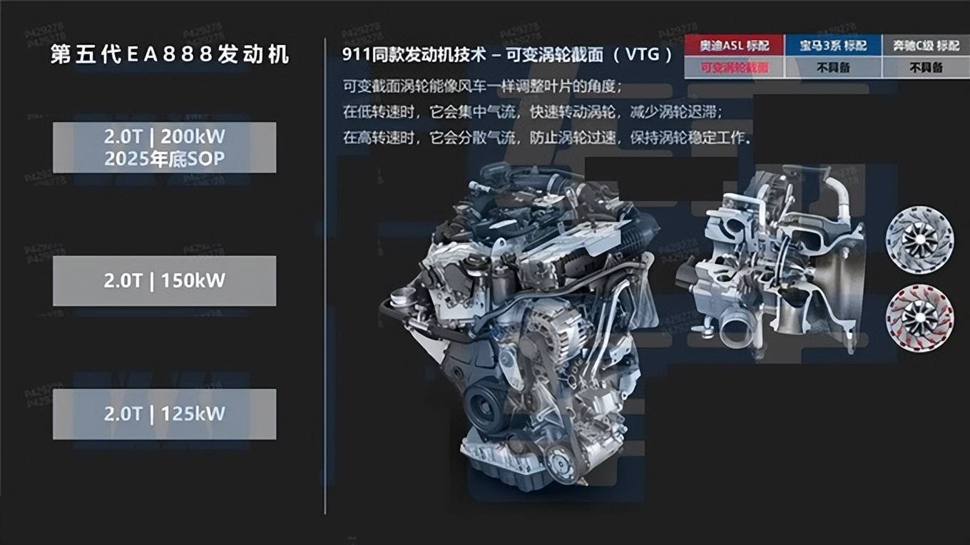 黑科技方面,這臺EA888發動機用的是保時捷同款技術,配備VTG可變截面渦輪,同時還提供48V輕混技術,以實現更低的油耗和更強的動力輸出。