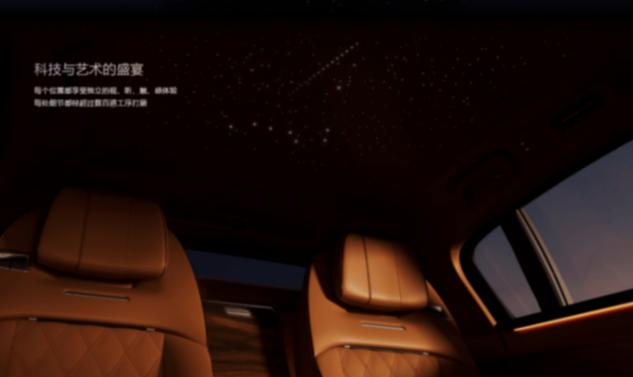 傳統超豪華車的座艙強調用料奢華和手工打造,比如勞斯萊斯標志性的星空頂,通過手工植入上千根光纖來模擬星光散射的效果。而在尊界S800上,智能星空頂的滿天繁星似乎還能展現出流動的效果,這便是創新科技帶來的革新體驗。