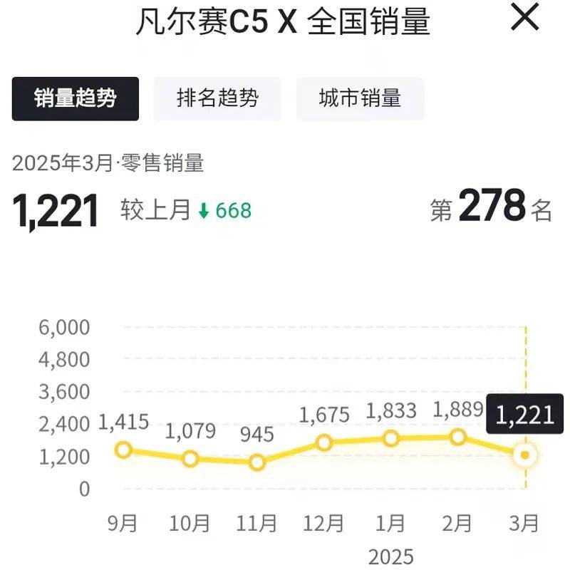 具體車型方面,2025年3月份,的銷量為1221輛,與今年2月份的銷量1889輛相比,環比下滑35.36%。而從單月銷量表現來看,今年前3個月,雪鐵龍凡爾賽C5 X的銷量幾乎都在1千輛以上,2000輛以下。