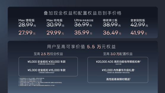 配置方面,Max版車型也做到了入門即調(diào)配。英國之寶音響、帆式主動升降尾翼、靜音電吸門、前排雙零重力座椅以及后排座椅通風(fēng)、加熱、按摩等一應(yīng)俱全,滿滿的奢華感、儀式感。