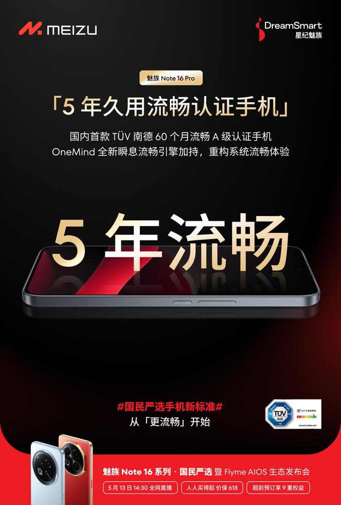5 月 11日消息,星紀(jì)魅族官微今日正式宣布,將于 5 月 13 日 14:30 舉行魅族 Note 16 系列暨 Flyme AIOS 生態(tài)發(fā)布會(huì)。此次發(fā)布會(huì)備受矚目,星紀(jì)魅族表示,這部即將登場(chǎng)的手機(jī)將成為 “人人買得起,用得爽的流暢耐用戰(zhàn)神”,有望刷新國(guó)民嚴(yán)選手機(jī)的新標(biāo)準(zhǔn)。