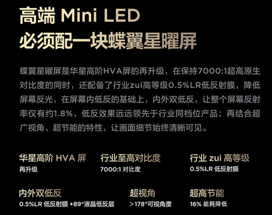 T6L Pro用的這塊蝶翼星曜屏,是2024年的高端旗艦Q10K Pro同款,算是Mini LED電視里頭頂配的存在了。它不是簡單加了一層膜,而是外層用了0.5%的行業最高等級LR低反膜,內層還有液晶低反層,液晶分子還做了規則排布,內外雙層一起上,整機反射率能做到1.8%。這也就意味著,不管是白天陽光直射,還是晚上開燈追劇,都能有效減少反光,畫面清晰度能一直在線。