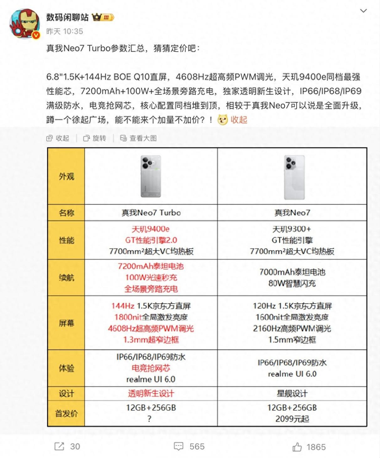 5 月 28 日,微博數碼博主@數碼閑聊站 昨日曝光了關于真我Neo7 Turbo 的配置信息:搭載天璣9400e 芯片,擁有 7200mAh 大電池以及 100W 光速秒充等等,相較于真我Neo7 可以說是全面提升。