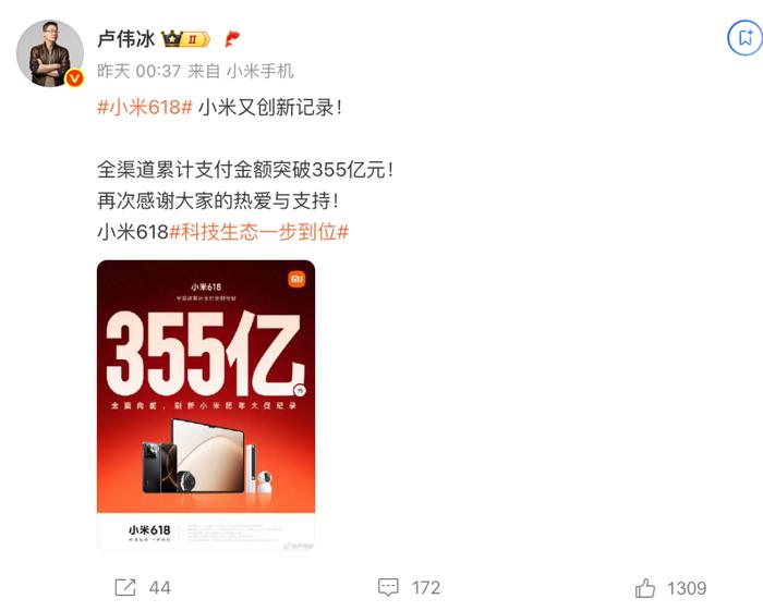 近日,小米集團合伙人、總裁,國際部總裁,Redmi 品牌總經理盧偉冰發(fā)布了小米 618 銷售戰(zhàn)報,數(shù)據(jù)顯示全渠道累計支付金額突破 355 億元,成功刷新了歷年大促的紀錄。