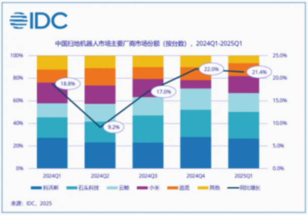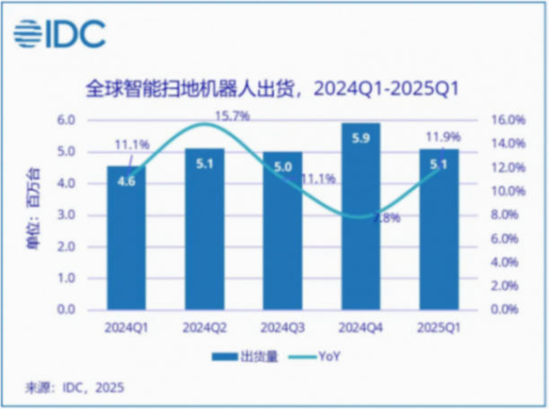 IDC數據顯示:2025年第一季度(1-3月)全球智能掃地機器人市場出貨量達509.6萬臺,同比增長11.9%;頭部廠商市場份額集中度加劇,Top5廠商出貨已占到整體市場的63.4%,較去年同期提升3.5%。中國頭部廠商持續擴張。