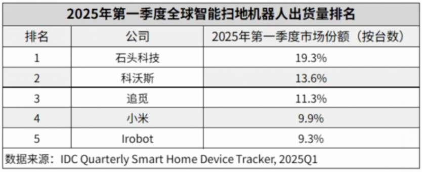 具體2025Q1全球市場來說,智能掃地機器人出貨量排名TOP5依次是:①(208.540, 0.04, 0.02%)(約19.3%份額)②(53.880, -0.23, -0.43%)(約13.6%份額)③追覓(約11.3%)④小米約(9.9%)⑤IroBot(約9.3%)。