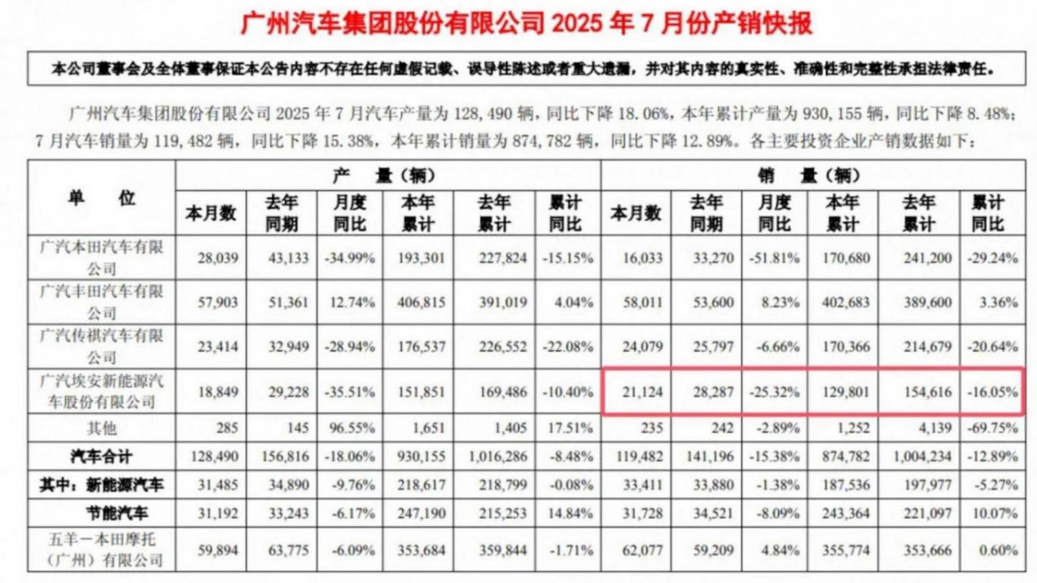 盡管新能源市場銷量火爆,但來自廣汽集團(tuán)的產(chǎn)銷快報卻顯示,廣汽埃安正遭遇新能源市場 “寒流”,銷量下滑勢頭持續(xù)擴(kuò)大。最新數(shù)據(jù)顯示,其7 月銷量 21124 輛,同比下滑 25.32%;前 7 月累計 129801 輛,同比下滑 16.05%。