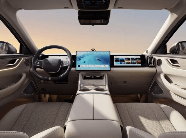 從內(nèi)飾圖片信息看,星紀(jì)元E05 車(chē)內(nèi)最為醒目的便是中軸對(duì)稱的三塊大屏,聯(lián)屏的布局合理,功能分區(qū)明確,既能滿足駕駛者對(duì)車(chē)輛信息的快速獲取需求,又為副駕駛乘客提供了豐富的娛樂(lè)體驗(yàn)。