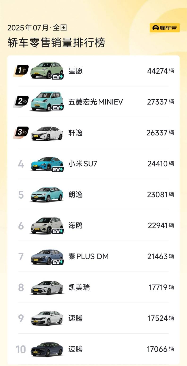 7月銷量榜出爐 小米SU7殺入前五,燃油車TOP10僅存三席