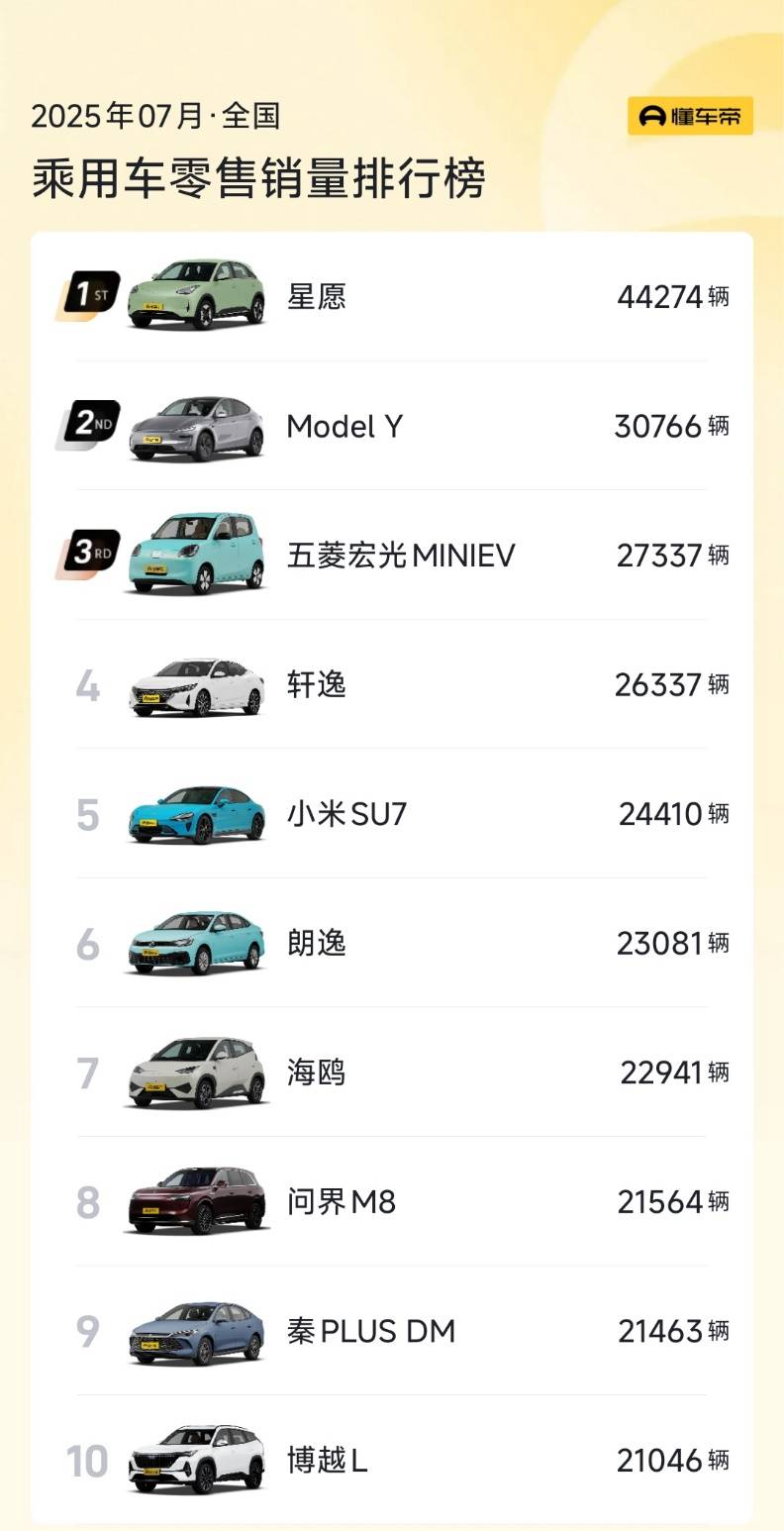 首頁 > 生活分享 > 免費教學 > 7月銷量榜出爐 小米SU7殺入前五,燃油車TOP10僅存三席