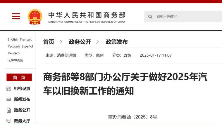 今年1月,商務部發布《商務部等8部門辦公廳關于做好2025年汽車以舊換新工作的通知》。在2024年報廢、置換、更新的基礎上,對2025年汽車領域工作作出部署。