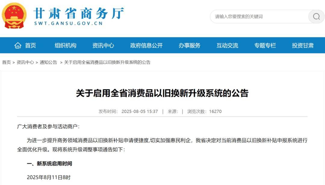 據中工汽車網獲悉,8月11日,甘肅省暫停53天的“以舊換新”補貼,于上午8時正式重啟。甘肅省商務廳發布的“關于啟用全省消費品以舊換新升級系統的公告”中指出,新系統適用于省內消費者申請汽車置換更新、家電以舊換新、3C數碼產品購新、電動自行車以舊換新、家裝廚衛“煥新”補貼;全省汽車報廢更新仍舊延用商務部“全國汽車流通信息管理平臺”進行補貼申報。
