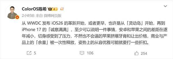 9月11日消息,ColorOS設(shè)計(jì)總監(jiān)陳希發(fā)文指出,從WWDC發(fā)布iOS 26的革新開(kāi)始,或許更早,也許是從靈動(dòng)島開(kāi)始,再到iPhone 17的誠(chéng)意滿滿,至少可以說(shuō)明一件事情,安卓和蘋(píng)果之間的差距在逐年減小,切身感受到了壓力,不然也不會(huì)逼的蘋(píng)果擠爆牙膏和讓出價(jià)格,商業(yè)與產(chǎn)品上的余量被一次性釋放,姿勢(shì)上的從容優(yōu)雅可能就要打一些折扣。