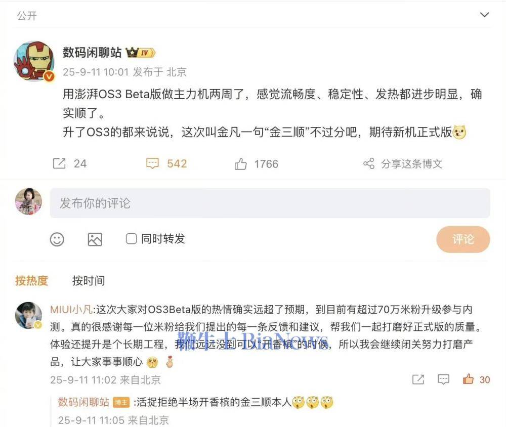 上午10點,博主“數碼閑聊站”在微博分享了體驗小米澎湃OS3 Beta版的感受,金凡現身評論區透露了一組數據:“截止目前已有超70萬米粉參與澎湃OS3 Beta版內測,感謝米粉支持,將會持續閉關努力打磨產品。”